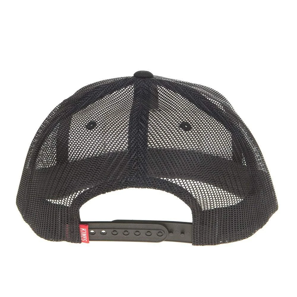 This Kimes Ranch trucker cap is an adjustable snapback that has a black front with a red logo stitched in the middle and white mesh backing.