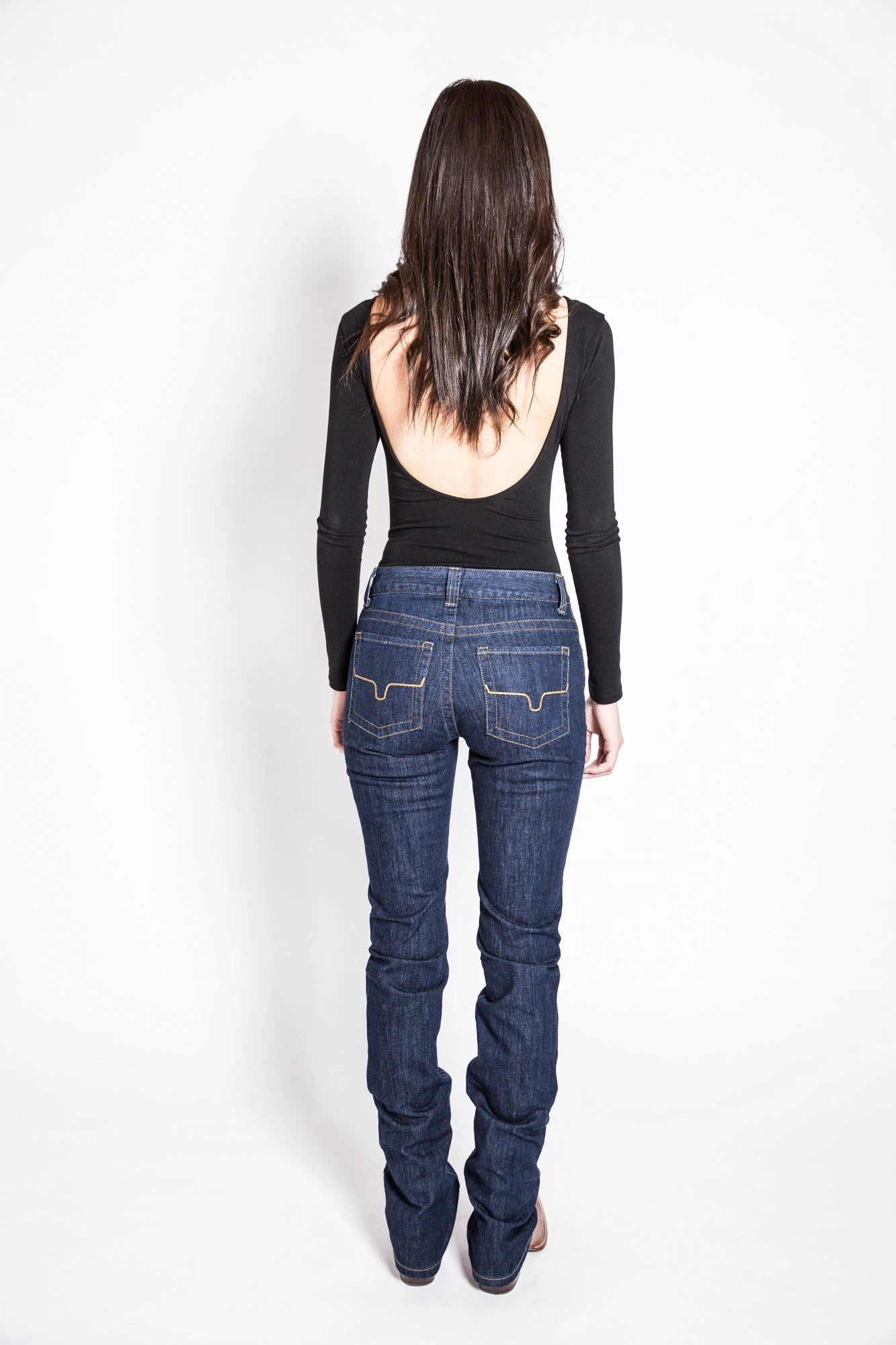Popular among cowboys and cowgirls, Kimes Ranch’s product deliver durability and comfortableness for the trail, ranch or city. This particular item, made from 99% cotton/1% spandex , features a mid rise, fitted thigh, and modest bootcut.